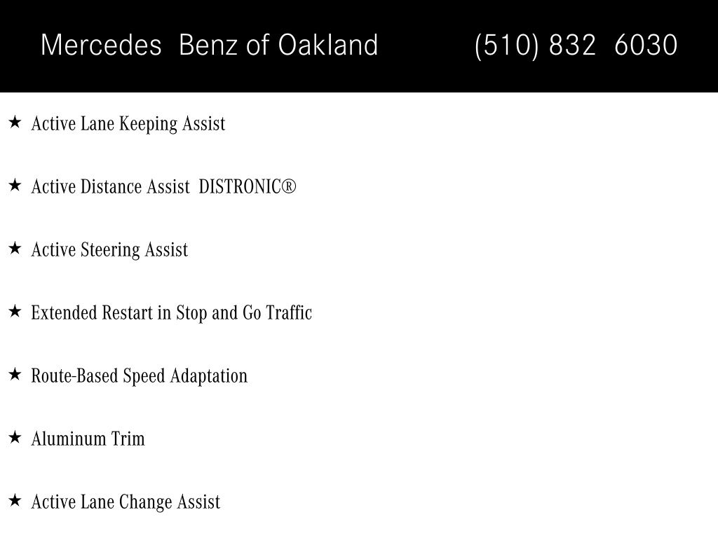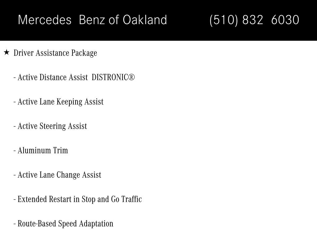 2.0L I4 Turbocharged, Active Distance Assist DISTRONIC®, Active Lane Change Assist, Active Lane Keeping Assist, Active Steering Assist, Aluminum Trim, Driver Assistance Package, Extended Restart in Stop and Go Traffic, Route-Based Speed Adaptation.